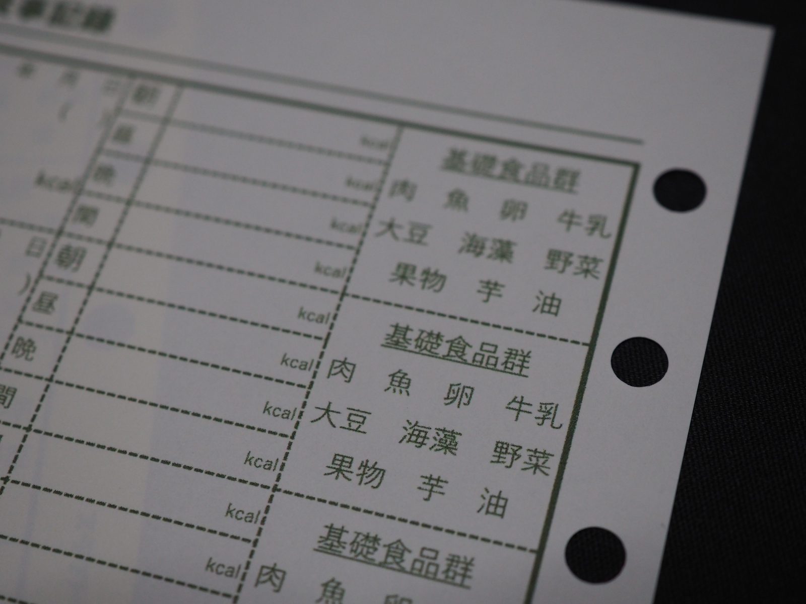 日付、曜日、朝昼夕の食事カロリー、基礎食品群の記録