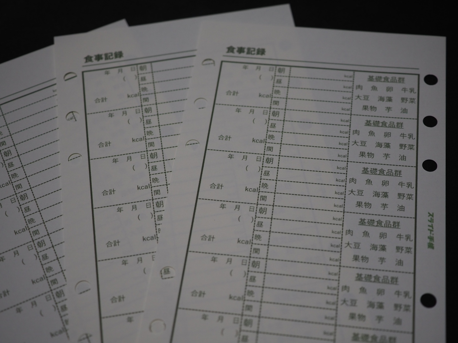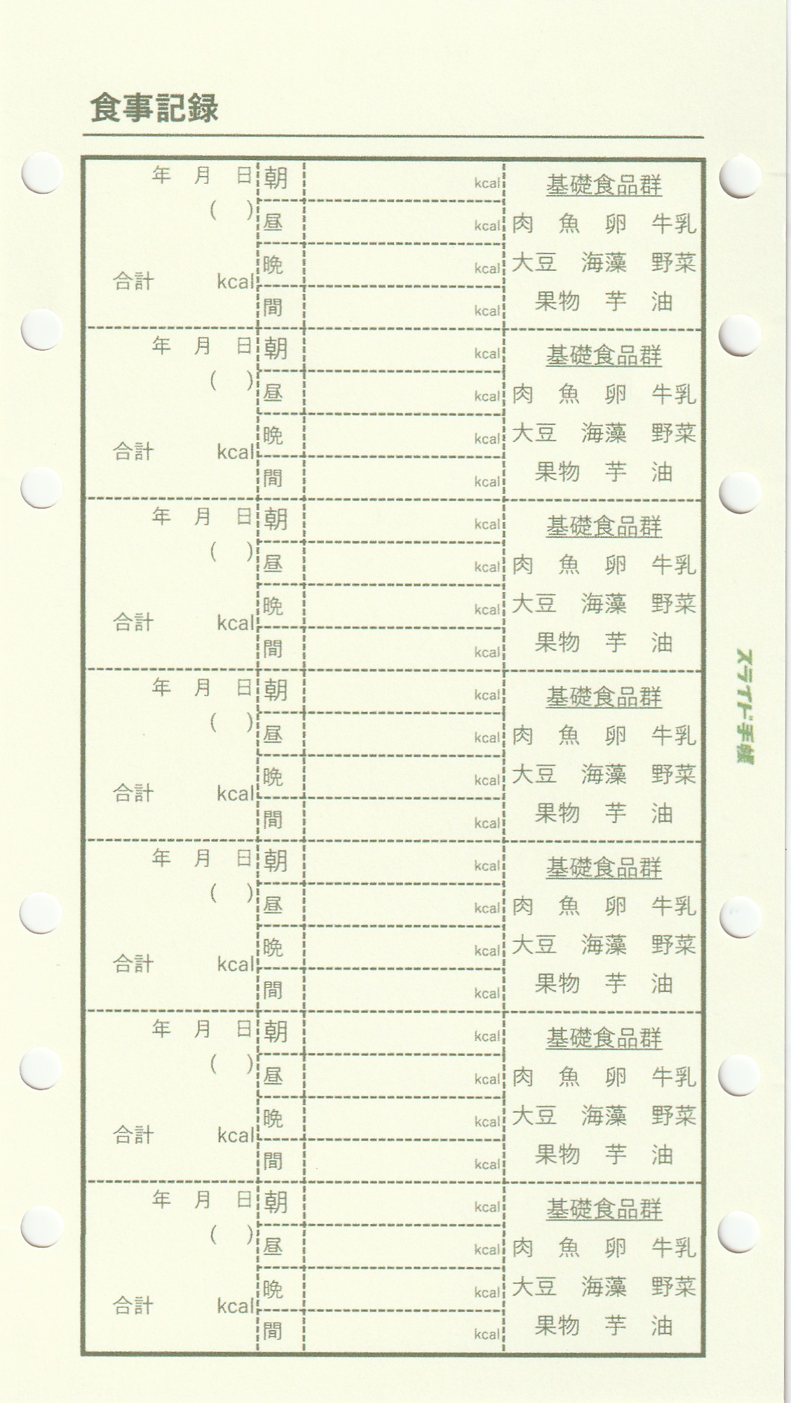 バイブルサイズだと幅が狭いので、カロリーと基礎食品群の記録を中心にフォーマットしてみました。