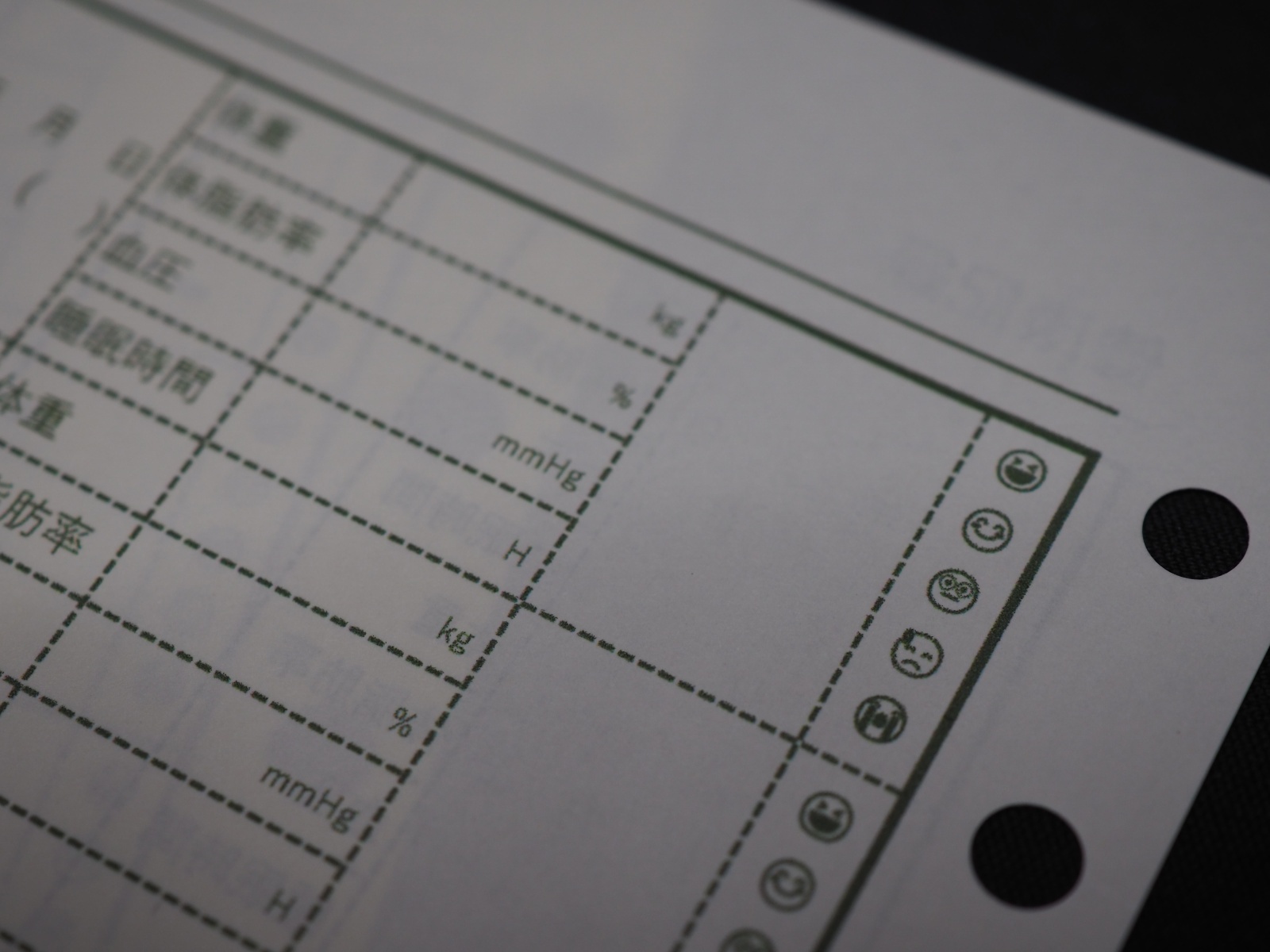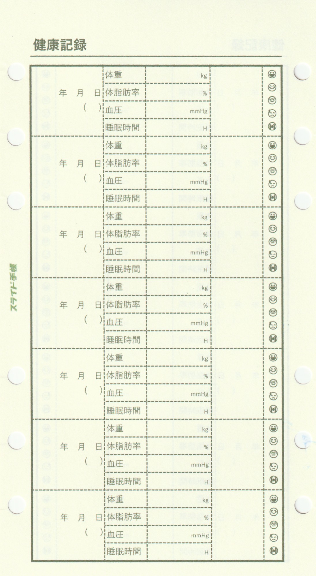 日付、曜日、体重、体脂肪率、血圧、睡眠時間、備考欄、気分・体調